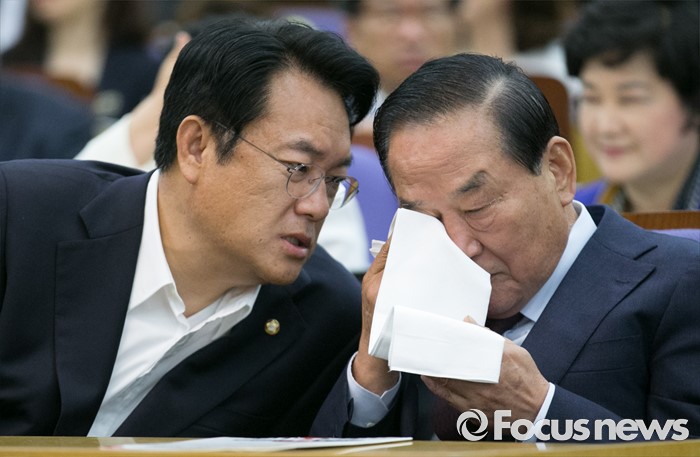 (서울=포커스뉴스) 8일 오전 서울 여의도 국회 의원회관에서 열린 국가미래전략포럼(일명 알파포럼) 창립총회 및 강연회에 참석한 정진석(왼쪽) 새누리당 원내대표와 서청원 전 최고위원이 대화하고 있다. 이날 정 원내대표와 서 전 최고위원은 국회의장직을 야당에 양보한다는 뜻을 밝혔다.
