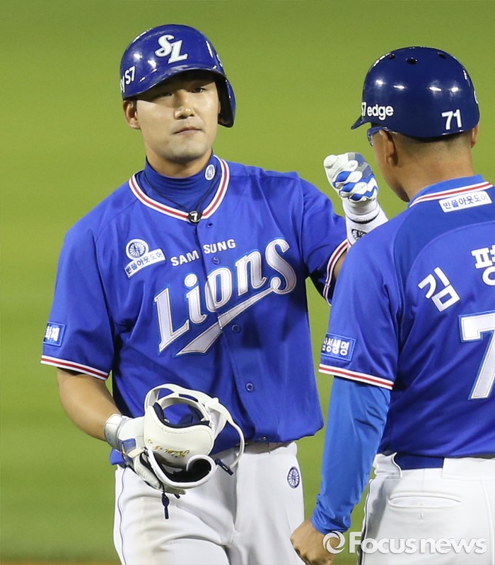 (서울=포커스뉴스) 7일 서울 잠실구장에서 열린 2016 프로야구 삼성-LG 경기 8회초 1사 만루에서 삼성 김상수가 주자를 모두 불러 들이는 역전 2루타를 치고 김평호 코치의 축하를 받고 있다.