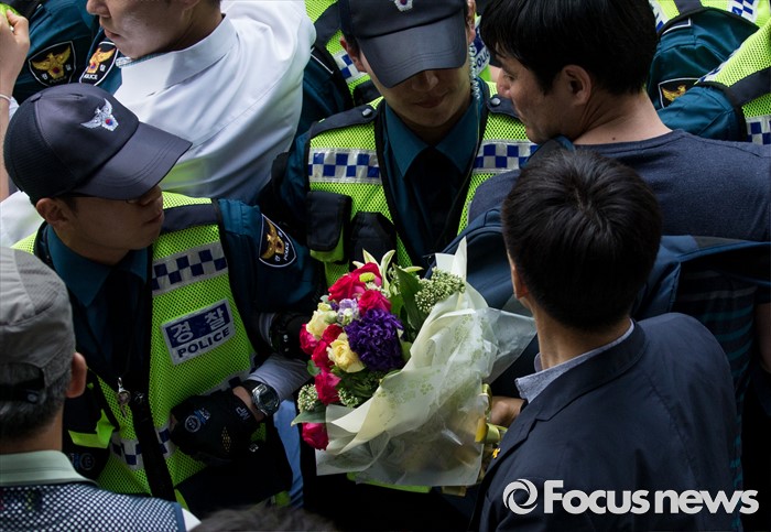 (서울=포커스뉴스) 8일 오후 서울 을지로 옛 국가인권위원회 옥상 광고탑에서 기아자동차 비정규직 노동자의 정규직화를 요구하며 363일 동안 고공농성을 벌인 한규협씨와 최정명씨가 경찰에 의해 구급차로 끌려가자 한 관계자가 차량을 향해 꽃다발을 전달하려 하고 있다.