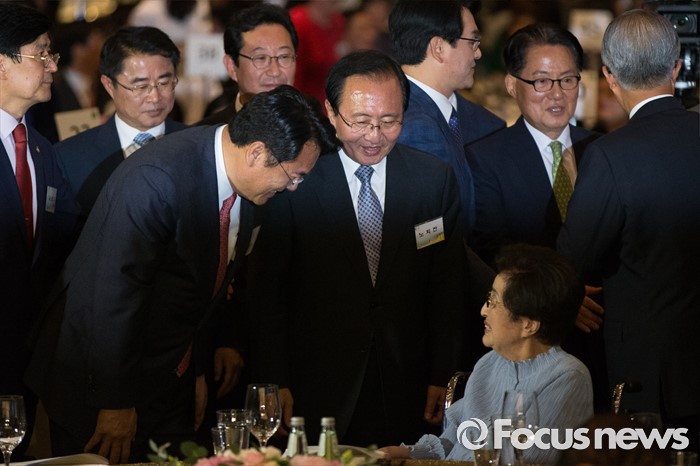 (서울=포커스뉴스) 9일 오후 서울 여의도구 63빌딩 그랜드볼룸에서 열린 '6.15 남북정상회담 16주년 기념식'에 참석한 정진석 새누리당 원내대표(왼쪽)와 노회찬 정의당 원내대표(가운데)가 이희호 여사와 인사하고 있다.