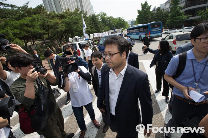 (서울=포커스뉴스) 세월호 특조위 윤천우 조사2과장이 산케이신문 전 서울지국장 사건 관련 자료 확보를 위해 실지조사에 나선 8일 오전 서울 서초구 서울중앙지검 삼거리에서 세월호 특조위 해체를 촉구 기자회견하는 고엽제전우회 회원 앞을 지나 지검으로 향하고 있다.