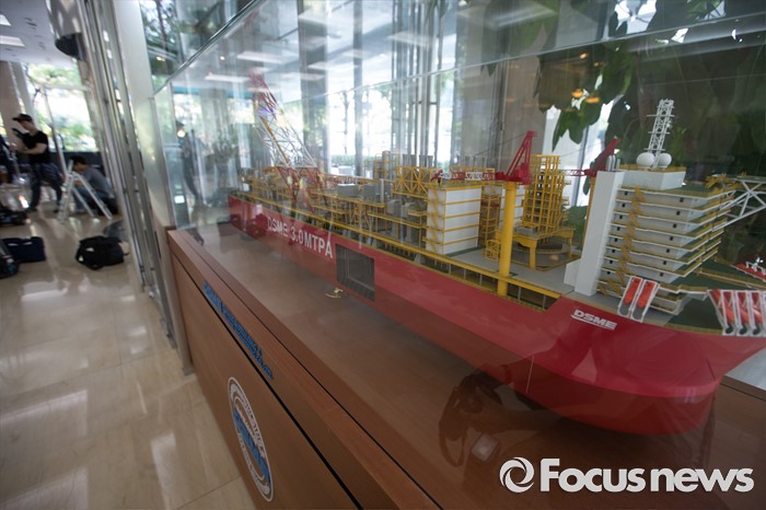 (서울=포커스뉴스) 부패범죄특별수사단이 대우조선해양 본사와 거제 욱포조선소를 압수수색한 8일 오후 서울 중구 대우조선해양빌딩 본사 로비에 조선소 배 모형이 보이고 있다.