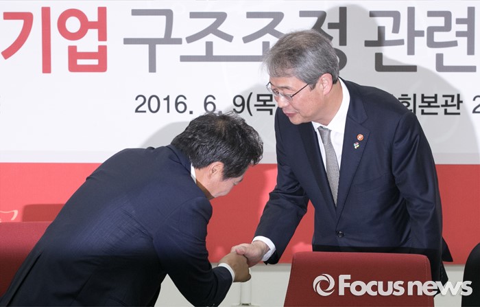(서울=포커스뉴스) 9일 오전 서울 여의도 국회에서 열린 산업·기업 구조조정 관련 당정간담회에 참석한 이학재(왼쪽) 새누리당 의원과 임종룡 금융위원장이 인사하고 있다.