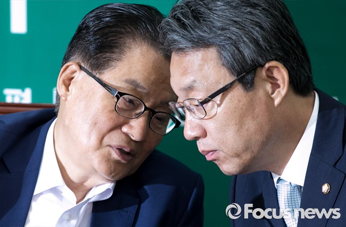 (서울=포커스뉴스) 8일 오전 서울 여의도 국회에서 열린 국민의당 최고위원회의에 참석한 박지원(왼쪽) 원내대표와 김성식 정책위의장이 대화하고 있다.