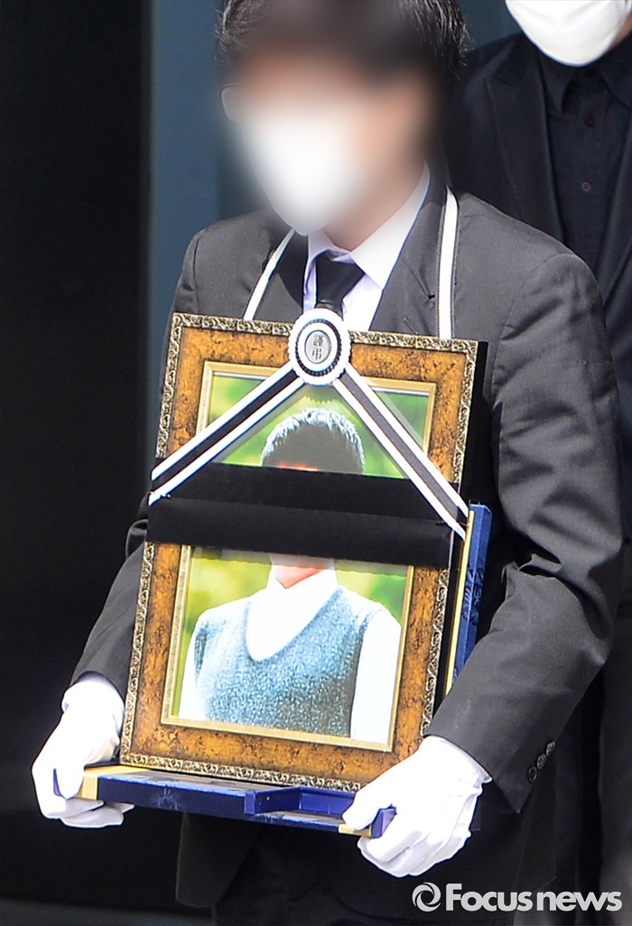 (서울=포커스뉴스) 서울 지하철 2호선 구의역에서 스크린도어를 정비하다가 숨진 김 모 군의 발인일인 9일 오전 서울 광진구 건국대학교병원 장례식장에서 고인의 영정이 운구차량으로 향하고 있다.