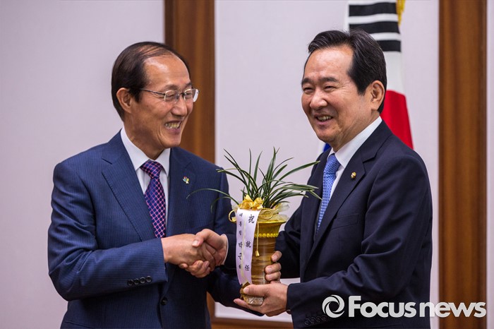 (서울=포커스뉴스) 이원종(왼쪽) 대통령비서실장이 10일 오전 서울 여의도 국회에서 정세균 국회의장을 예방해 박근혜 대통령의 축하 난을 전달 하고 있다.