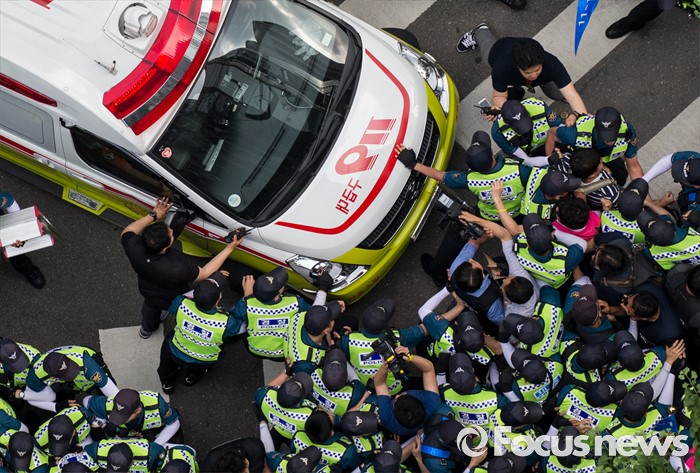 (서울=포커스뉴스) 8일 오후 서울 을지로 옛 국가인권위원회 옥상 광고탑에서 기아자동차 비정규직 노동자의 정규직화를 요구하며 363일 동안 고공농성을 벌인 한규협씨와 최정명씨가 경찰에 의해 구급차로 끌려가자 노조원들이 차량을 막아서고 있다.