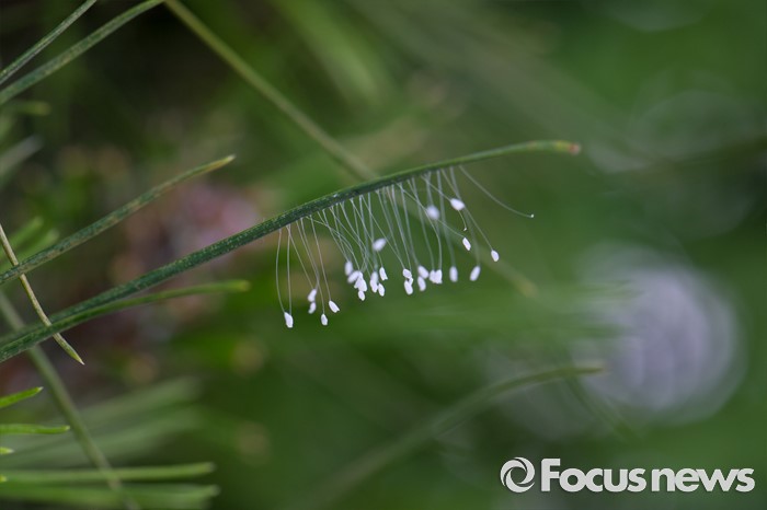 (서울=포커스뉴스) 9일 오전 서울 용산구 행정공제회 주차장 소나무 잎에 우담바라가 피어있다. 불교계에서 우담바라를 신성시 하는 것과 달리 학계에선 실잠자리의 알이나 곰팡이의 일종으로 보고있다.