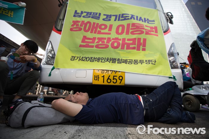 (서울=포커스뉴스) 8일 오후 서울 영등포구 여의도 환승센터 앞에서 경기장애인차별철폐공동투쟁단원들이 장애인 이동권 보장을 촉구하며 경기도행 버스를 막아서고 구호를 외치고 있다.