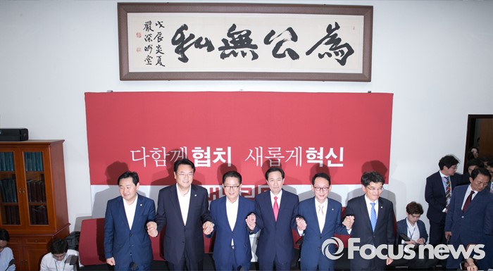 (서울=포커스뉴스) 8일 오후 서울 여의도 국회 새누리당 원내대표실에서 20대 국회 원구성 협상 등을 위한 3당 원내지도부 회동에 참석한 의원들이 포즈를 취하고 있다. 오른쪽부터 박완주 더불어민주당 원내수석부대표, 김도읍 새누리당 원내수석부대표, 우상호 더불어민주당 원내대표, 박지원 국민의당 원내대표, 정진석 새누리당 원내대표, 김관영 국민의당 원내수석부대표.