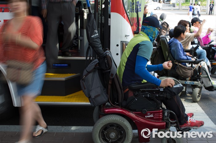 (서울=포커스뉴스) 8일 오후 서울 영등포구 여의도 환승센터 앞에서 경기장애인차별철폐공동투쟁단원들이 장애인 이동권 보장을 촉구하며 경기도행 버스를 막아서고 구호를 외치고 있는 가운데 승객들이 버스에서 내리고 있다.