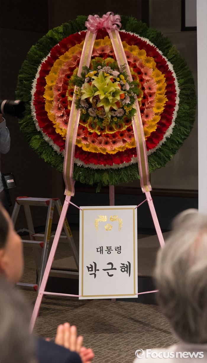 (서울=포커스뉴스) 10일 오전 서울 중구 프레스센터에서 열린 6.10 민주항쟁 제29주년 기념식에 박근혜 대통령의 화환이 놓여 있다.