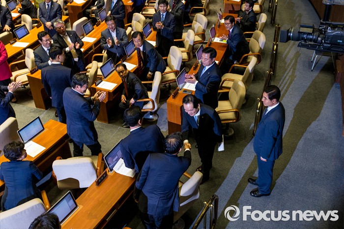 (서울=포커스뉴스) 9일 오후 서울 여의도 국회에서 열린 본회의에서 20대 국회 전반기 국회의장으로 선출된 정세균 더불어민주당 의원이 수락 연설을 하기 위해 연단으로 이동하며 동료의원들에게 축하 받고 있다.