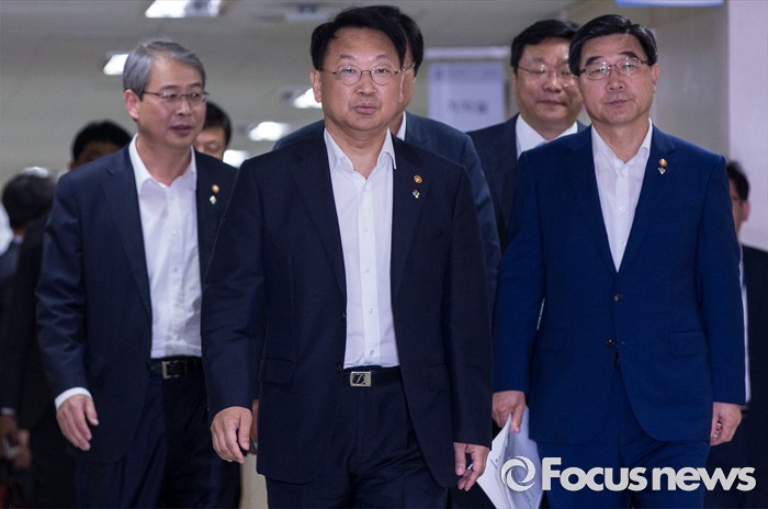 (서울=포커스뉴스) 8일 오전 서울 종로구 정부서울청사에서 유일호 부총리 겸 기획재정부 장관, 이기권 고용노동부 장관, 임종룡 금융위원장, 주형환 산업통상자원부 장관, 김영석 해양수산부 장관이 구조조정 추진현황 및 계획에 대해 발표하기 위해 발걸음을 옮기고 있다.