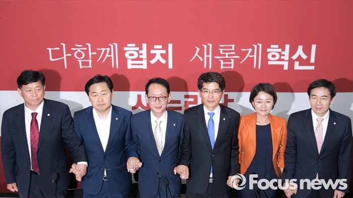 (서울=포커스뉴스) 여야 3당이 20대 국회 원구성에 합의한 8일 오후 서울 여의도 국회 새누리당 원내대표실에서 3당 원내지도부 회동 결과를 발표한 의원들이 취재진을 향해 포즈를 취하고 있다. 왼쪽부터 김명연 새누리당 원내대변인, 김관영 국민의당 원내수석부대표, 김도읍 새누리당 원내수석부대표, 박완주 더불어민주당 원내수석부대표, 이재정 원내대변인, 이용호 국민의당 원내대변인.