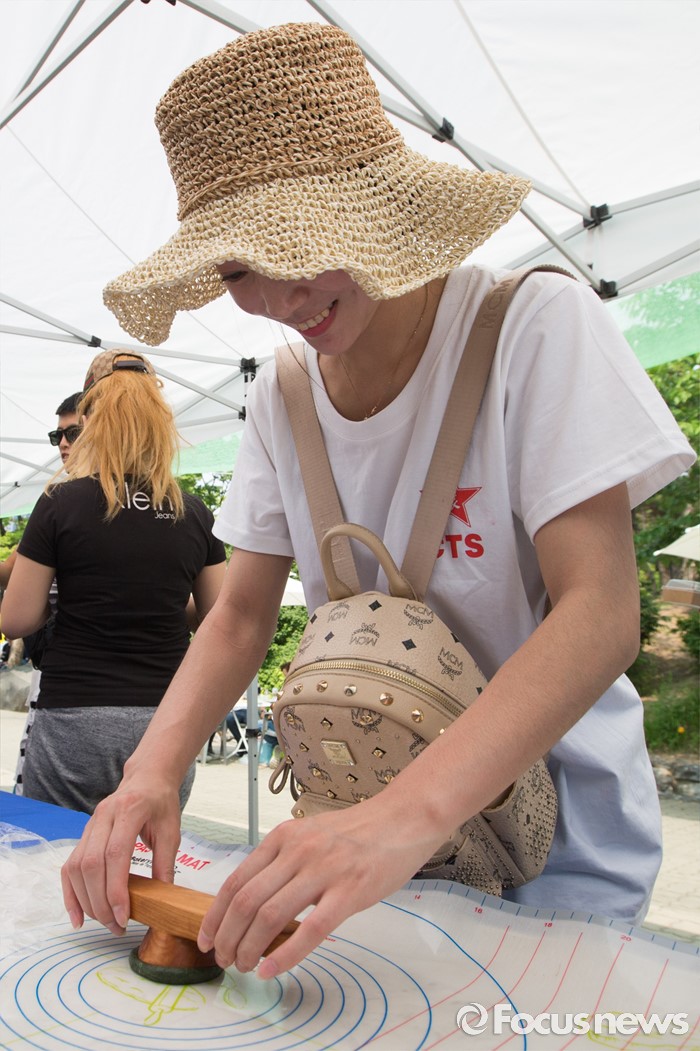 (서울=포커스뉴스) 9일 오후 단오 세시풍속을 체험하기 위해 서울 중구 남산 한옥마을을 방문한 중국 관람객이 수리취떡 만들기 체험을 하고 있다.