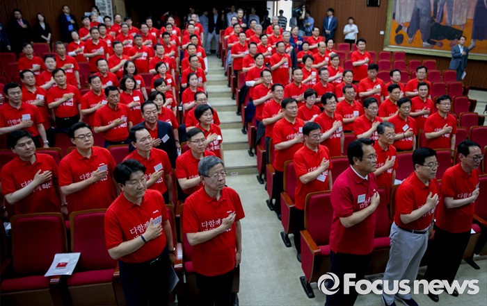 (과천=포커스뉴스) 10일 오전 경기도 과천 국가공무원인재개발원에서 열린 2016 새누리당 정책워크숍에 참석한 김희옥 혁신비대위원장, 정진석 원내대표 등 의원들이 국기에 대한 경례를 하고 있다.
