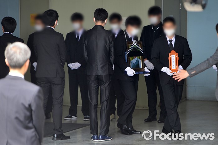 (서울=포커스뉴스) 서울 지하철 2호선 구의역에서 스크린도어를 정비하다가 숨진 김 모 군의 발인일인 9일 오전 서울 광진구 건국대학교병원 장례식장에서 고인의 영정과 관이 운구차량으로 향하고 있다.