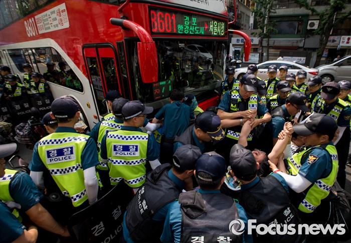 (서울=포커스뉴스) 9일 오전 서울시청 서소문별관 인근의 버스정류장에서 장애인차별철폐연대 회원들이 장애인 이동권 보장을 촉구하며 경기도행 광역버스 기습 점거시위를 벌여 경찰과 충돌하고 있다.