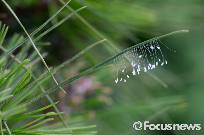 (서울=포커스뉴스) 9일 오전 서울 용산구 행정공제회 주차장 소나무 잎에 우담바라가 피어있다. 불교계에서 우담바라를 신성시 하는 것과 달리 학계에선 실잠자리의 알이나 곰팡이의 일종으로 보고있다.
