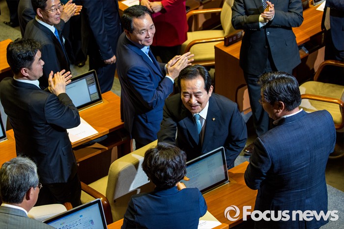 (서울=포커스뉴스) 9일 오후 서울 여의도 국회에서 열린 본회의에서 20대 국회 전반기 국회의장으로 선출된 정세균 더불어민주당 의원이 수락 연설을 하기 위해 연단으로 이동하며 동료의원들에게 축하 받고 있다.