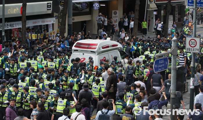 (서울=포커스뉴스) 사내하청 전원 정규직화를 요구하며 고공농성을 벌여온 기아자동차 사내하청 노동자 최정명씨와 한규협씨가 농성을 해제한 8일 오후 서울 중구 옛 국가인권위원회 건물 옥상 광고탑 농성장에서 내려와 병원으로 이동하던 중 경찰과 노조원들이 실랑이를 벌이고 있다.