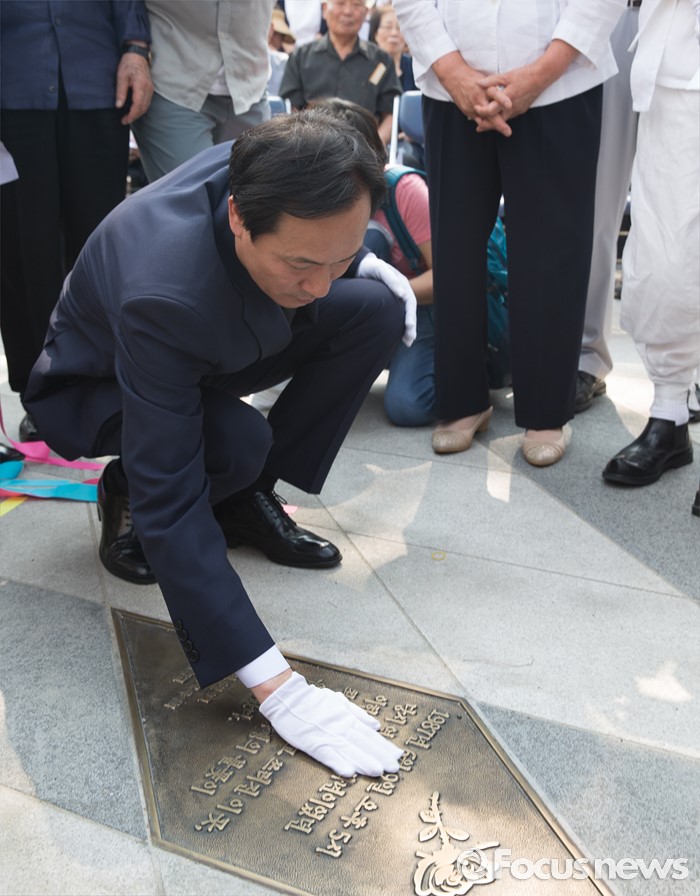 (서울=포커스뉴스) 9일 오후 서울 서대문구 연세대학교 정문 앞에서 열린 '제29주기 이한열 열사 동판 제막식에 참석한 87년 당시 연세대학교 총학생회장을 지낸 더불어민주당 우상호 의원이 이한열 열사 동판을 어루만지고 있다.