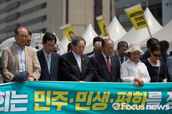 (서울=포커스뉴스) 10일 오전 서울 종로구 광화문 광장에서 민주주의국민행동 단체 회원들이 6.10 민주항생 29주년 관련 기자회견 전 묵념을 하고 있다.
