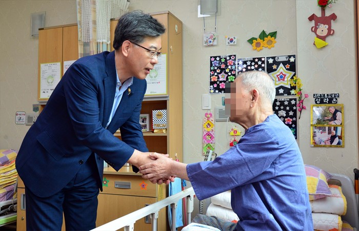 (대전=포커스뉴스) 송언석 기획재정부 차관이 8일 대전시 유성구 대전보훈요양원을 방문해 입소 어르신의 손을 잡으며 위문을 하고 있다. <사진제공=기획재정부>