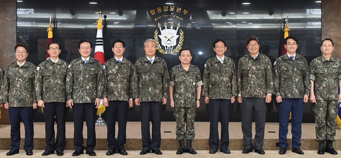 (서울=포커스뉴스) 김종인 더불어민주당 비대위 대표가 8일 오전 서울 용산구 합동참모본부를 방문해 이순진 합참의장 등 관계자들과 기념촬영을 하고 있다. <사진제공=더불어민주당>