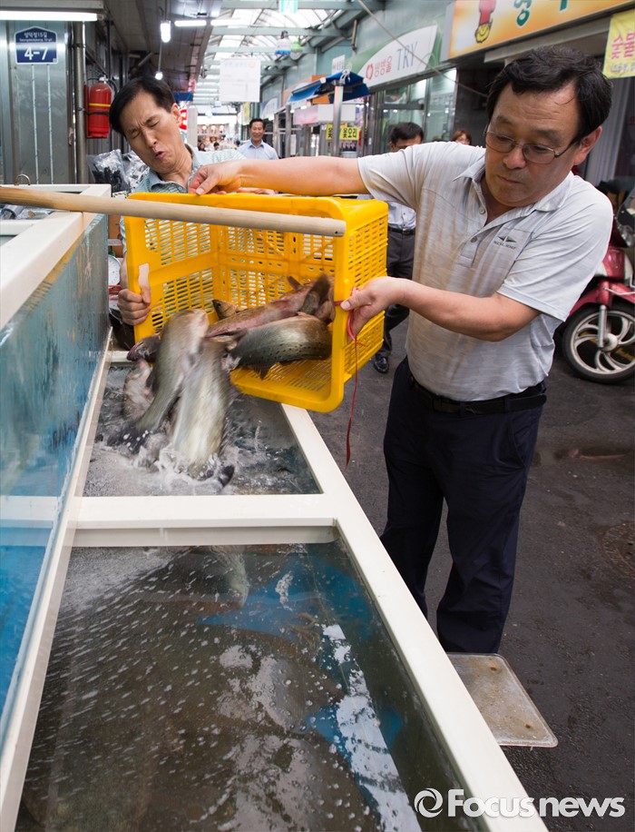 (서울=포커스뉴스) 10일 오후 서울 성동구 뚝도시장에서 성동구청 관계자들이 서해 5도 활어들을 횟집 수족관으로 옮기고 있다. 6월부터 8월까지 2, 4주 금요일에 뚝도시장에 수산물 장서는 날을 운영하며 9월부터는 7일장 형태로 상설운영 할 예정이다.