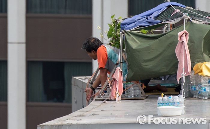 (서울=포커스뉴스) 8일 오후 서울 을지로 옛 국가인권위원회 옥상 광고탑에서 기아자동차 비정규직 노동자의 정규직화를 요구하며 363일 동안 고공농성을 벌인 한규협씨가 경찰과 대화하고 있다.