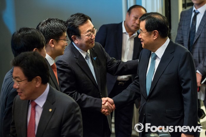 (서울=포커스뉴스) 김정훈(오른쪽) 새누리당 의원과 서병수 부산광역시장이 8일 오전 서울 여의도 켄싱턴호텔에서 열린 '새누리당 부산시당-부산광역시 당정 협의'에 참석해 악수 하고 있다.
