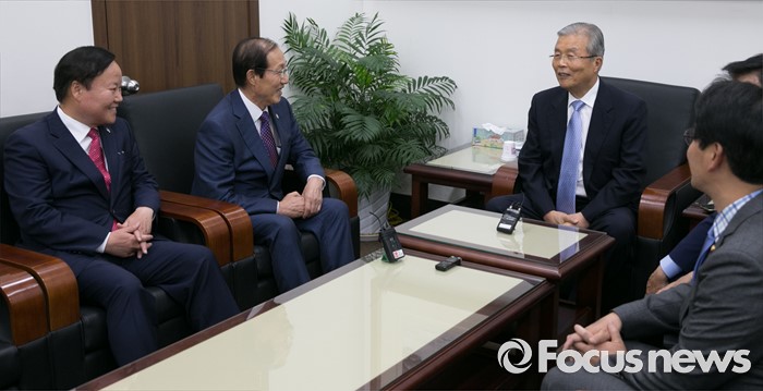 (서울=포커스뉴스) 김종인(오른쪽) 더불어민주당 비대위 대표가 10일 오후 서울 여의도 국회를 방문한 이원종(가운데) 대통령비서실장, 김재원 청와대 정무수석과 면담을 하고 있다.