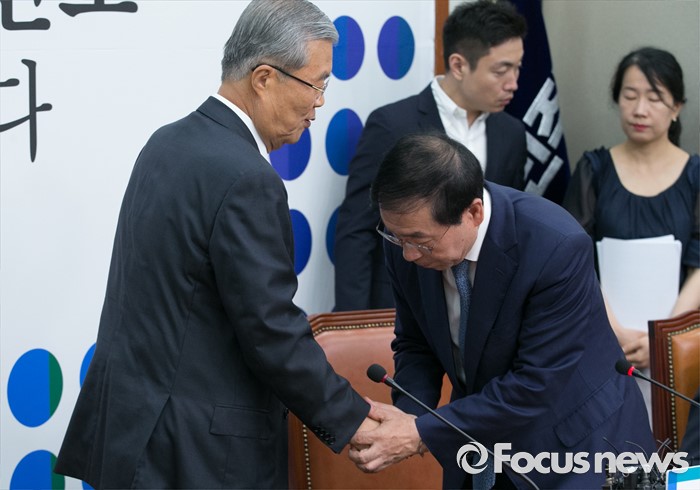 (서울=포커스뉴스) 8일 오전 서울 여의도 국회에서 구의역 스크린도어 노동자 사망 사건과 관련해 열린 더불어민주당-서울시 정책간담회에 참석한 김종인(왼쪽) 비대위 대표가 먼저 퇴장하며 박원순 서울시장과 악수하고 있다.