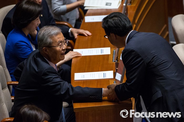 (서울=포커스뉴스) 김종인 더불어민주당 비상대책위 대표가 9일 오후 서울 여의도 국회에서 열린 본회의에 참석해 동료 의원과 악수 하고 있다.