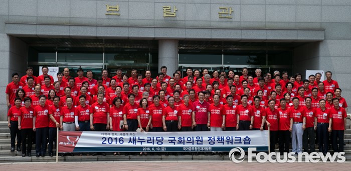 (과천=포커스뉴스) 10일 오전 경기도 과천 국가공무원인재개발원에서 열린 2016 새누리당 정책워크숍에 참석한 김희옥 혁신비대위원장, 정진석 원내대표 등 의원들이 기념촬영을 하고 있다.