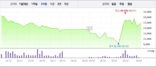 현대상선은 5월27일과 28일, 31일, 그리고 6월2일 각각 가격제한폭인 29.65%, 29.92%, 13.56%, 3.14%의 상승폭을 기록하며 뚜렷한 상승곡선을 보여 왔다. 그러나 8일 외국인이 ‘팔자’에 나서면서 14.91%의 하락폭을 나타냈다.