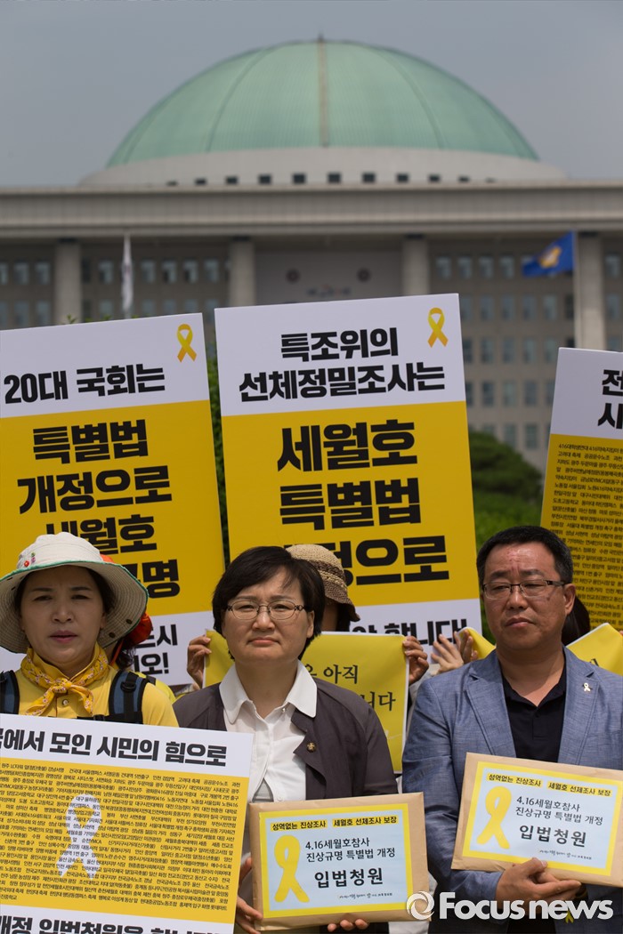 (서울=포커스뉴스) 8일 오전 서울 여의도 국회 앞에서 4.16가족협의회와 4.16연대 관계자들이 세월호 진상규명 특별법 개정 입법청원 기자회견을 하고 있다.