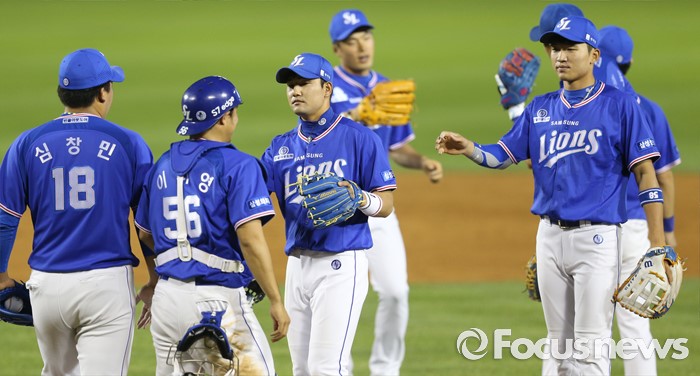 (서울=포커스뉴스) 7일 서울 잠실구장에서 열린 2016 프로야구 삼성-LG 경기에서 8회 8득점으로 역전승한 삼성 선수들이 경기를 마치고 마운드에 모여 승리의 기쁨을 함께하고 있다.
