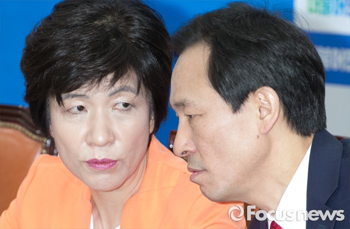 (서울=포커스뉴스) 9일 오전 서울 여의도 국회에서 열린 더불어민주당 가계부채TF, 현황 및 정부대책 보고에 참석한 우상호(오른쪽) 원내대표와 김영주 TF 위원장이 대화하고 있다.
