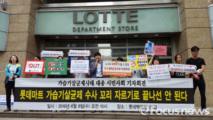 환경운동연합과 가습기살균제 피해자와 가족모임(가피모)을 비롯한 7개 환경시민단체는 8일 오전 서울 중구 롯데백화점 본점 앞에서 기자회견을 열고 "검찰의 롯데마트 가습기살균제 수사가 꼬리 자르기로 끝나선 안 된다"고 밝혔다.