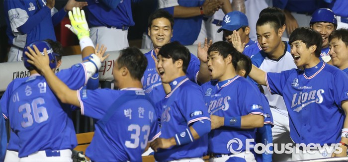(서울=포커스뉴스) 7일 서울 잠실구장에서 열린 2016 프로야구 삼성-LG 경기 8회초 2사 1,2루에서 삼성 이승엽이 우월 3점 홈런을 치고 덕아웃에서 동료들의 축하를 받고 있다.