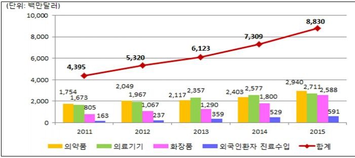 우선 보건산업 분야 상품(의약품·의료기기·화장품)의 2015년 수출액은 82억 달러로, 2014년 68억 달러 대비 18% 증가했다.