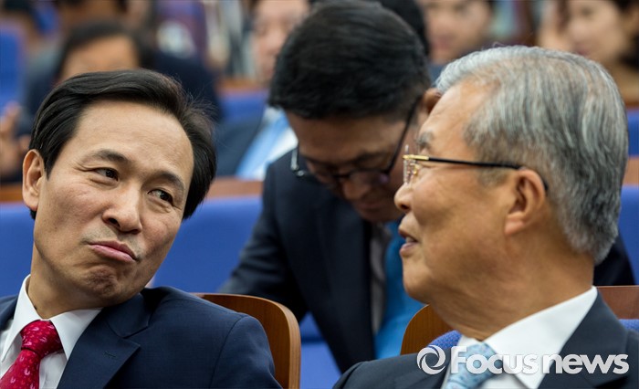 (서울=포커스뉴스) 김종인(오른쪽) 더불어민주당 비상대책위 대표와 우상호 원내대표가 9일 오전 서울 여의도 국회에서 열린 의원총회에 참석해 대화를 나누고 있다.
