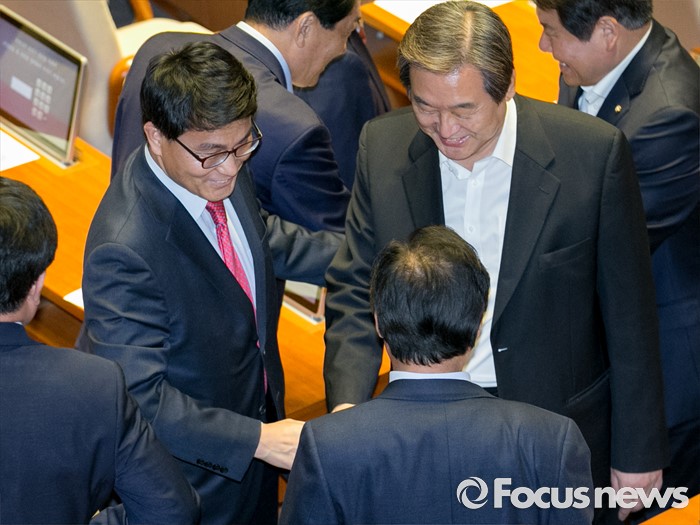 (서울=포커스뉴스) 9일 오후 서울 여의도 국회에서 열린 20대 국회 첫 본회의에 참석한 김무성(오른쪽) 새누리당 전 대표와 윤상현 무소속 의원이 인사하고 있다.