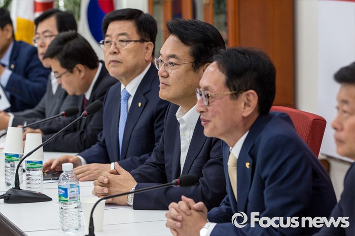 (서울=포커스뉴스) 정진석(오른쪽 세 번째) 새누리당 원내대표를 비롯한 지도부가 8일 오전 서울 여의도 국회에서 열린 원내대책회의에 참석하고 있다.