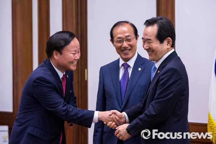 (서울=포커스뉴스) 정세균(오른쪽) 국회의장이 10일 오전 서울 여의도 국회에서 김재원(왼쪽) 청와대 정무수석과 면담에 앞서 악수 하고 있다.