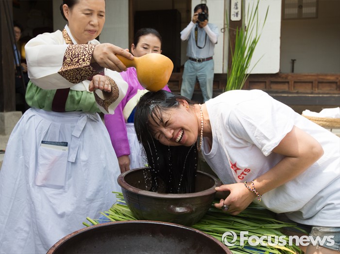 (서울=포커스뉴스) 9일 오후 단오 세시풍속을 체험하기 위해 서울 중구 남산 한옥마을을 방문한 중국 관광객이 창포물 머리감기 체험을 하고 있다.