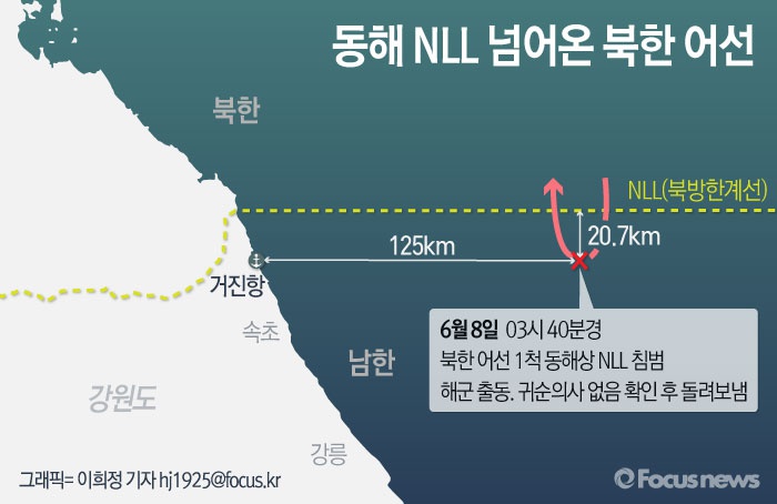 합동참모본부는 이날 오전 3시 40분 쯤 북한 어선 1척이 강원도 거진항 동쪽 125km 지점에서 NLL 이남 20.7km까지 이남해 했던 것을 우리 어선이 신고했다고 밝혔다.